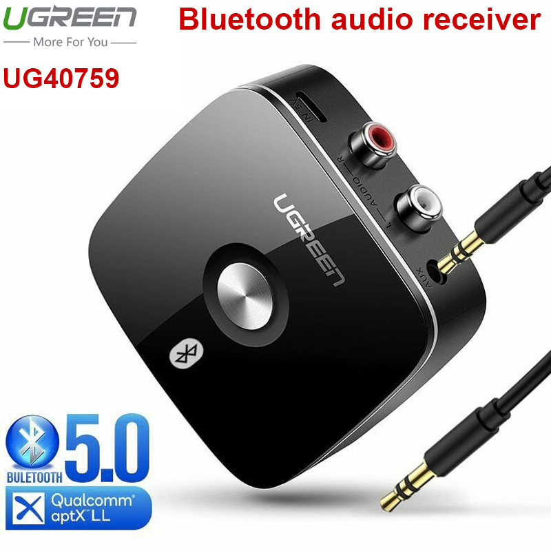 Đầu nhận Bluetooth 5.0 Ugreen 40759 hỗ trợ aptX, giúp loa, amply phát nhạc không dây chất lượng cao từ điện thoại, laptop. Kết nối qua jack 3.5mm hoặc RCA, dùng nguồn 5V, không tích hợp pin.