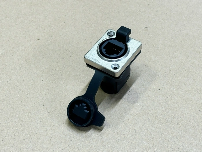 Đầu nối mạng RJ45 chống nước IP65 LC-CAT6-L dạng bẻ góc 90°, thiết kế lắp bảng chắc chắn, có nắp cao su bảo vệ. Phù hợp cho tủ điện, hệ thống mạng, LED, audio, môi trường ngoài trời và công nghiệp.