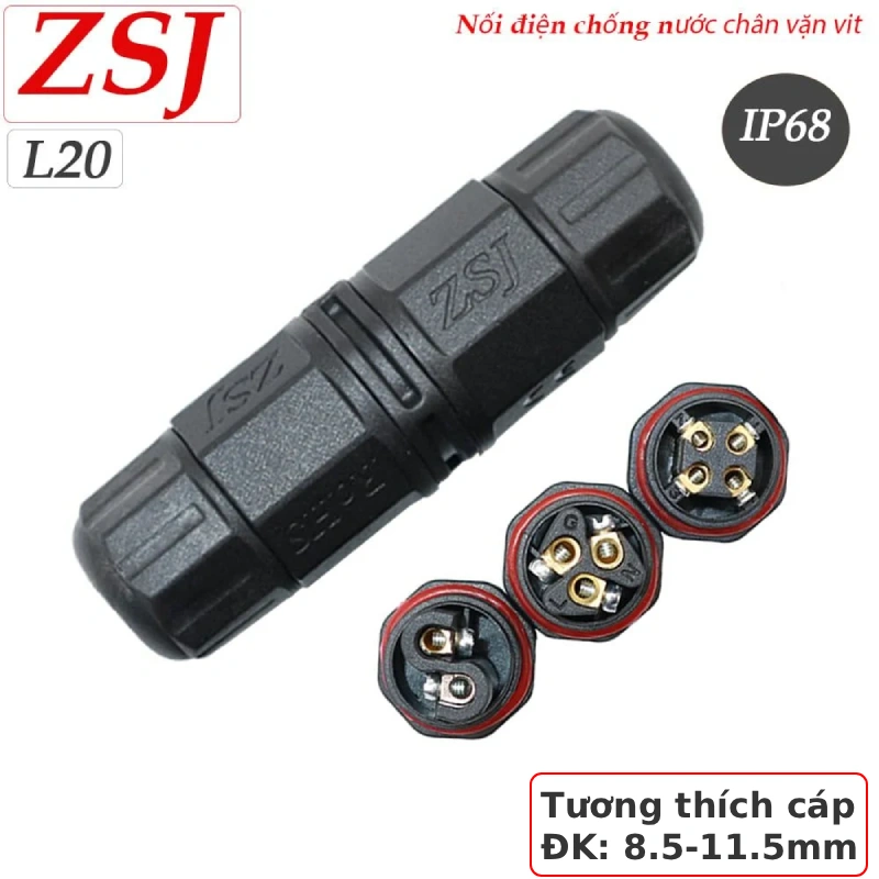 Đầu nối dây điện chống nước IP68 ZSJ-L20 (2P/3P/4P) dùng nối dây cáp điện ngoài trời an toàn và bền bỉ. Hỗ trợ cáp Ø8.5–11.5mm, chân tiếp xúc hợp kim đồng dẫn điện tốt, vỏ nhựa kỹ thuật chống cháy UL94-V0. Thiết kế khóa ren kín nước, phù hợp đèn LED, camera, điện sân vườn, năng lượng mặt trời.