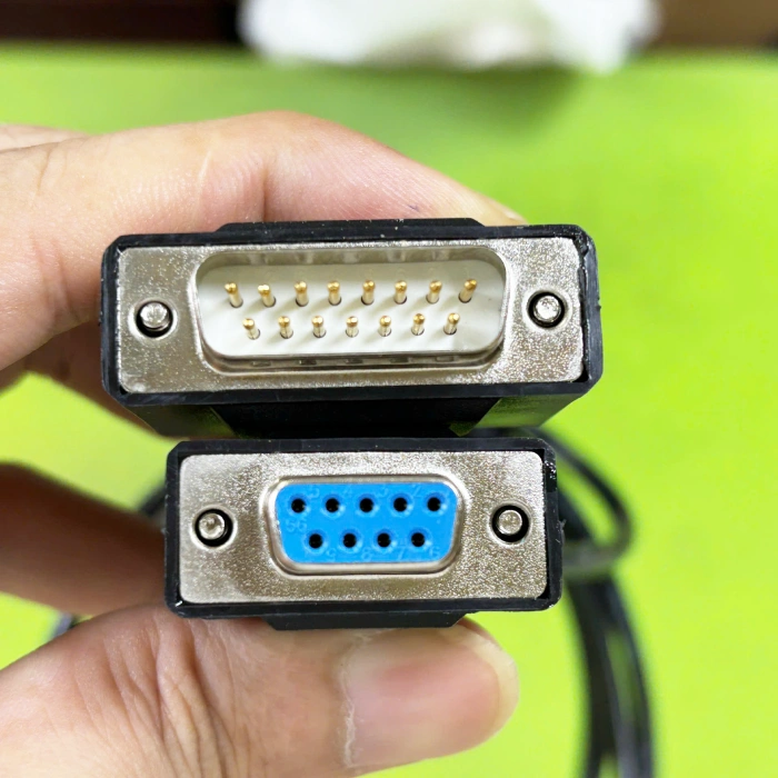 Đầu cáp gồm DB9 cái và DB15 đực, phù hợp với nhiều chuẩn giao tiếp trong công nghiệp và hệ thống điều khiển.